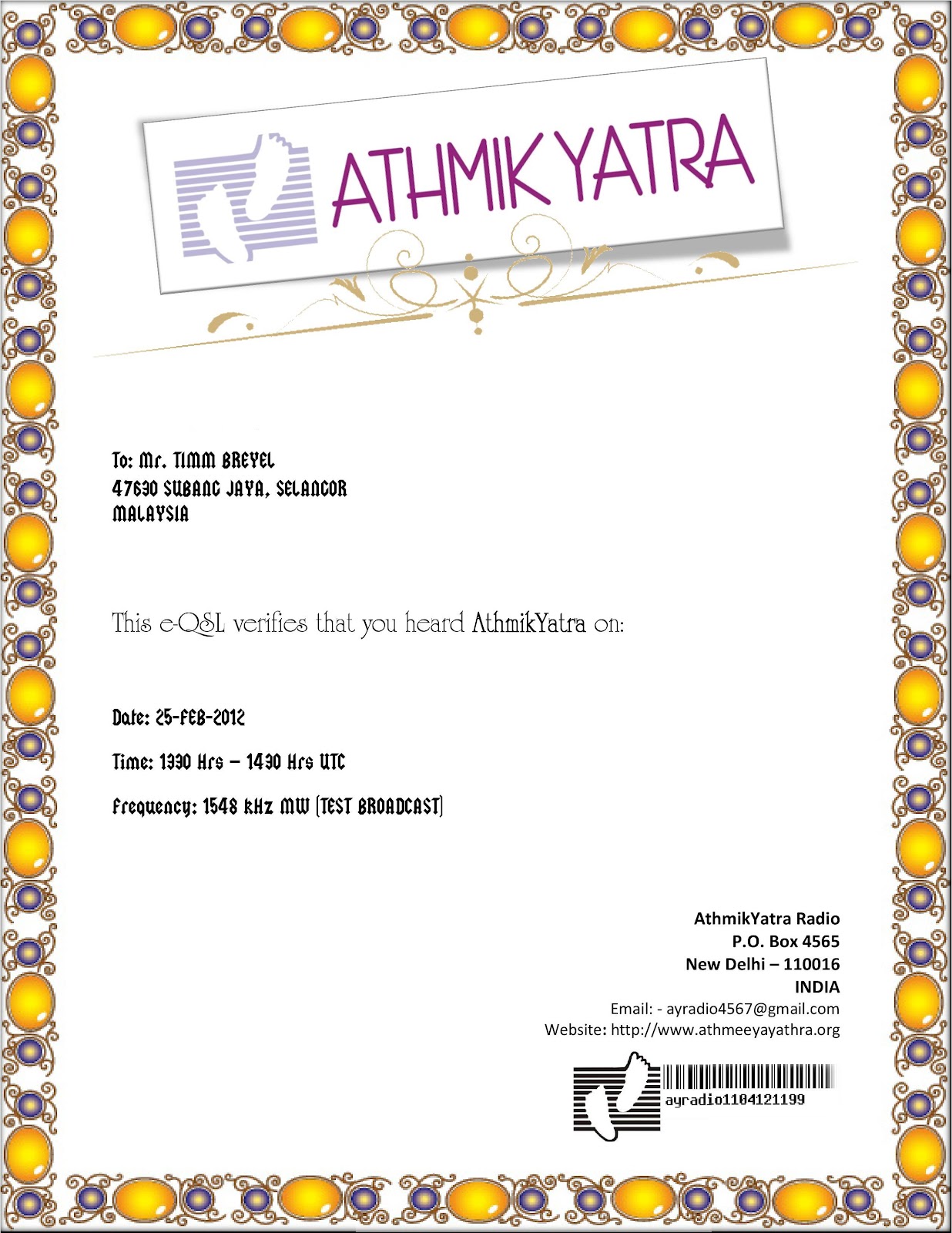 Athmik Yatra Radio in a test transmission via Trincomalee, Sri Lanka was heard on 25 February 2012. Broadcast was monitored from 13.30 to 14.30 UTC (test transmission was from 13.00 to 15.00 UTC) on 1548 kHz -- the former Deutsche Welle frequency from Trincomalee relay station. Reception (SINPO) was 25332 -- fair signal strength and audible speech despite transmitter hum, severe atmospheric noise, and fading every six or seven seconds. By 14.30 UTC signal was too weak to receive.