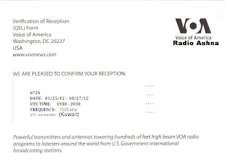 Reception report was subsequently emailed to VOA. On 30 August 2012, VOA Public Relations sent the following email: "Thank you for your email and reception report on Radio Ashna. It’s always nice to hear from our audiences around the world. I have shared your message with our Audience Mail Department, they will send you a QSL card in the mail soon. Thank you again for your interest in VOA programs." The promised QSL card arrived with a 2013 VOA calendar on 8 February 2013.
