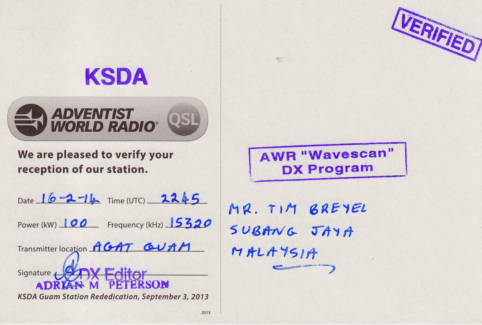 Adventist World Radio (AWR) / Wavescan, transmitting from Agat, Guam, was logged on 16 February 2014. Between 22.45 to 23.00 UTC (broadcast time 22.30 to 23.00 UTC) Salahuddin Dolar presented Bangladesh DX Report, a review of "Australian Radio History" by Bruce Carty was heard, Brazilian performer Daniela Mercury closed the show, then Jeff White announced two special QSL cards for reception reports and next week's Australian DX Report. Reception on 15.320 kHz was (SINPO): 55455 -- excellent reception.